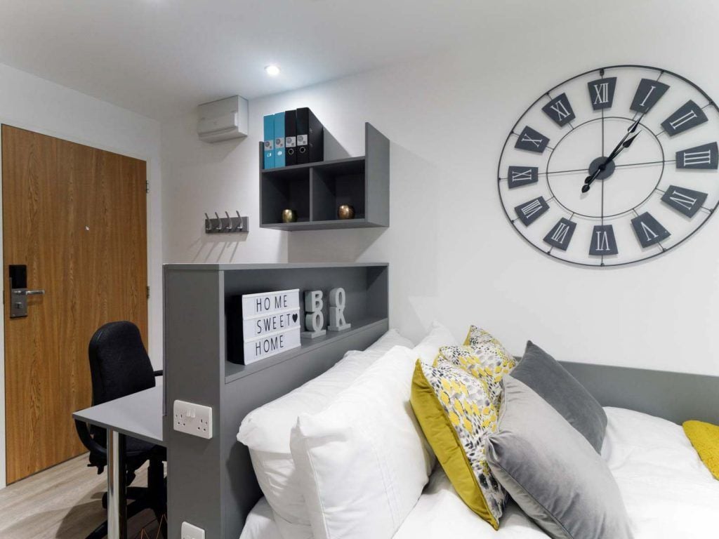 When it comes to choosing your room, you have a range of en suite rooms in shared apartments and studios, all of which have contents insurance and all bills included in the price. These modern and purposefully built rooms vary in size and price so you can be sure to find your perfect home away from home. Inside your room, you can find a study area, storage space, a bed, an en suite bathroom and a private kitchen inside the studio rooms.